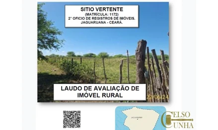 SITIO VERTENTE”, com uma área total de 367,50 hectares, imóvel Rural. SITIO VERTENTE Cidade: JAGUARUANA UF:CE CEP: 62.823-000