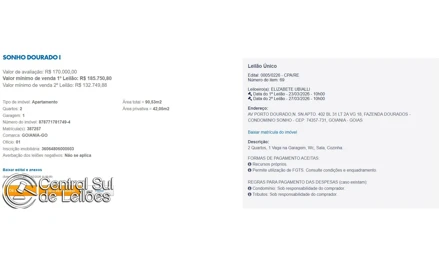 ITEM 69 ESTADO: GO MUNICÍPIO: GOIANIA EMPREENDIMENTO: SONHO DOURADO I ENDEREÇO: AV PORTO DOURADO, N. SN, Apto. 402, BL 31 LT 2A VG 18 BAIRRO: FAZENDA DOURADOS - CONDOMINIO SONHO DOUR DESCRIÇÃO: Apartamento, 90,53 m2 de área total, 42,05 m2 de área privativa, 2 qts, WC, sl, cozinha, 1 vaga de garagem. IPTU: 36064806000503 Matrícula: 387257 Ofício: 1. NÚMERO DO BEM: 8787717817494 VALOR DE AVALIAÇÃO (R$): R$ 170.000,00 VALOR DE VENDA 1º LEILÃO (R$): R$ 185.750,80 LEIA COM ATENÇÃO : Obs.: em caso de arrematação, fique atento à sua caixa de e-mail no dia do leilão. Obs.: o apregoamento sequencial dos lotes se dará no dia 23/03/26 às 10:00h, iniciando pelo primeiro lote do leilão/edital, com cronômetro regressivo de 30 segundos para fechamento do lote, devendo ser acompanhado pelo link ao vivo” disponível na página inicial do site na data do leilão. Obs.: O interessado em arrematar qualquer lote ofertado deverá obrigatoriamente realizar cadastro prévio no portal de imóveis da Caixa Econômica Federal ( https://venda-imoveis.caixa.gov.br/sistema/busca-imovel.asp?sltTipoBusca=imoveis ) . Caso haja mais de um arrematante, ambos precisam possuir cadastro no site da Caixa. Obs.: Informamos que a CAIXA e o leiloeiro não enviam BOLETO para pagamento da proposta ofertada. O boleto é OBRIGATORIAMENTE gerado pelo cliente no portal www.caixa.gov.br/imoveiscaixa , após a homologação da licitação, conforme disposto em edital. Obs.: Cada imóvel possui as suas próprias condições de pagamento, podendo, eventualmente, serem alteradas, devendo ser observada essa informação na página do anúncio do imóvel no www.caixa.gov.br/ imoveiscaixa , no dia do leilão. Obs.: Os interessados que desejarem contar com financiamento habitacional na modalidade SBPE e/ou utilizar recursos da conta vinculada do FGTS (nos casos aplicáveis) devem necessariamente submeter-se à análise e aprovação prévia de crédito perante uma Agência da Caixa Econômica Federal, antes da participação na disputa. Obs: os débitos que recaem sobre o imóvel, sejam eles de natureza fiscal (IPTU e/ou foro) e condominial (por cotas inadimplidas, sejam ordinárias ou extraordinárias), devem ser levantados e quitados exclusivamente pelos interessados/adquirentes