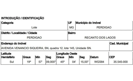 AVENIDA VENANCIO SIQUEIRA,N. S/N QD 12, LT 145, CENTRO - CEP: 35545-000, PERDIGAO - MINAS GERAIS