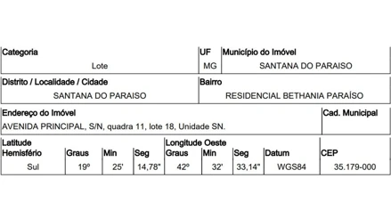 AVENIDA PRINCIPAL,N. 00 QD 11, LT 18, RES BETÂNIA PARAÍSO - CEP: 35179-000, SANTANA DO PARAISO - MINAS GERAIS