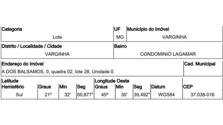 ALAMEDA DOS BALSAMOS,N. 00 QD 02, LT 28, CONDOMINIO LAGAMAR - CEP: 37038-016, VARGINHA - MINAS GERAIS