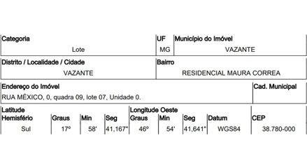 RUA MÉXICO,N. 00 QD 09, LT 07, RESID. MAURA CORREA - CEP: 38780-000, VAZANTE - MINAS GERAIS