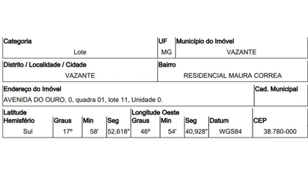 AVENIDA DO OURO,N. 00 QD 01, LT 11, RESID. MAURA CORREA - CEP: 38780-000, VAZANTE - MINAS GERAIS