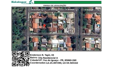 Nº. Produto: 1 Item 12, Quadra 8, Lote 360, TAPIR, RUA, nº 43, Terreno (m2) 453,30 Casa (m2) 72,70 Matricula 42400, Vila A1 Valor Avaliação R$-498.000,00