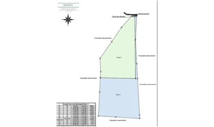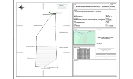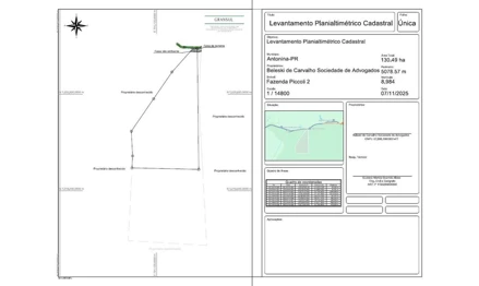 (Lote Único - Identificado como Parte 2 nas Imagens): Área de 130,49 hectares de imóvel rural denominado Fazenda Piccoli cuja área total é de 266,6979 hectares situado na altura do KM 321, da BR 116, localizado no município e Comarca de Antonina/PR. O perímetro da área de 136,09 hectares descrita abaixo, está Georreferenciada no Sistema Geodésico Brasileiro, e tem início no marco denominado TBTO-P-41920 de coordenadas Plano Retangulares Relativas, Sistema U T M - Datum SIRGAS2000 , Este (X) 731.672,72 m e Norte (Y) 7.221.616,81 m referentes ao meridiano central 51°00'; daí, confrontando com Rod. Régis Bittencourt, com azimute de 91°53'13" e distância de 23,08 m, segue até o marco TBTO-P-41921 de coordenada Norte (Y) 7.221.616,05 m, Este (X) 731.695,79 m ; daí, confrontando com Rod. Régis Bittencourt, com azimute de 90°27'10" e distância de 44,29 m, segue até o marco TBTO-P-41922 de coordenada Norte (Y) 7.221.615,70 m, Este (X) 731.740,08 m ; daí, confrontando com Rod. Régis Bittencourt, com azimute de 179°21'00" e distância de 1.848,99 m, segue até o marco TBTO-P-41923 de coordenada Norte (Y) 7.219.766,83 m, Este (X) 731.761,06 m ; daí, confrontando com Beleski de Carvalho Sociedade de Advogados, com azimute de 271°12'52" e distância de 1.019,06 m, segue até o marco TBTO-P-41924 de coordenada Norte (Y) 7.219.788,43 m, Este (X) 730.742,23 m ; daí, confrontando com Beleski de Carvalho Sociedade de Advogados, com azimute de 2°54'20" e distância de 184,26 m, segue até o marco TBTO-P-41925 de coordenada Norte (Y) 7.219.972,45 m, Este (X) 730.751,57 m ; daí, confrontando com Proprietário desconhecido, com azimute de 357°05'03" e distância de 380,00 m, segue até o marco TBTO-P-41926 de coordenada Norte (Y) 7.220.351,96 m, Este (X) 730.732,24 m ; daí, confrontando com Proprietário desconhecido, com azimute de 34°24'59" e distância de 600,00 m, segue até o marco TBTO-P-41927 de coordenada Norte (Y) 7.220.846,93 m, Este (X) 731.071,36 m ; daí, confrontando com Proprietário desconhecido, com azimute de 34°25'00" e distância de 499,99 m, segue até o marco TBTO-P-41928 de coordenada Norte (Y) 7.221.259,40 m, Este (X) 731.353,96 m ; Finalmente do marco TBTO-P-41928 segue até o marco TBTO-P-41920 , (início da descrição), confrontando com Proprietário desconhecido, com azimute de 41°43'43", e distância de 478,90 m, fechando assim o perímetro acima descrito. O perímetro do imóvel descrito pela matrícula nº 8.984 do CRI de Antonina/PR, cuja área é de 266,6979 hectares, está Georreferenciado no Sistema Geodésico Brasileiro, e tem início no marco denominado P1 de coordenadas Plano Retangulares Relativas, Sistema U T M - Datum SIRGAS2000 , Este (X) 731.801,44 m e Norte (Y) 7.221.623,54 m referentes ao meridiano central 51°00'; daí, confrontando com Proprietário desconhecido, com azimute de 183°18'28" e distância de 725,46 m, segue até o marco P2 de coordenada Norte (Y) 7.220.899,29 m, Este (X) 731.759,58 m ; daí, confrontando com Proprietário desconhecido, com azimute de 176°55'00" e distância de 700,00 m, segue até o marco P3 de coordenada Norte (Y) 7.220.200,30 m, Este (X) 731.797,23 m ; daí, confrontando com Proprietário desconhecido, com azimute de 176°55'01" e distância de 436,40 m, segue até o marco P4 de coordenada Norte (Y) 7.219.764,53 m, Este (X) 731.820,70 m ; daí, confrontando com Proprietário desconhecido, com azimute de 176°55'00" e distância de 1.163,59 m, segue até o marco P5 de coordenada Norte (Y) 7.218.602,62 m, Este (X) 731.883,29 m ; daí, confrontando com Proprietário desconhecido, com azimute de 273°24'58" e distância de 700,00 m, segue até o marco P6 de coordenada Norte (Y) 7.218.644,33 m, Este (X) 731.184,53 m ; daí, confrontando com Proprietário desconhecido, com azimute de 273°25'01" e distância de 500,00 m, segue até o marco P7 de coordenada Norte (Y) 7.218.674,13 m, Este (X) 730.685,42 m ; daí, confrontando com Proprietário desconhecido, com azimute de 2°55'01" e distância de 700,00 m, segue até o marco P8 de coordenada Norte (Y) 7.219.373,22 m, Este (X) 730.721,04 m ; daí, confrontando com Proprietário desconhecido, com azimute de 2°55'03" e distância de 414,74 m, segue até o marco P9 de coordenada Norte (Y) 7.219.787,42 m, Este (X) 730.742,15 m ; daí, confrontando com Beleski de Carvalho Sociedade e Advogados, com azimute de 91°12'58" e distância de 1.019,14 m, segue até o marco P10 de coordenada Norte (Y) 7.219.765,79 m, Este (X) 731.761,06 m ; daí, confrontando com Beleski de Carvalho Sociedade e Advogados, com azimute de 0°00'01" e distância de 1,04 m, segue até o marco P11 de coordenada Norte (Y) 7.219.766,83 m, Este (X) 731.761,06 m ; daí, confrontando com Rod. Régis Bittencourt, com azimute de 359°21'00" e distância de 1.848,99 m, segue até o marco TBTO-P-41922 de coordenada Norte (Y) 7.221.615,70 m, Este (X) 731.740,08 m ; daí, confrontando com Rod. Régis Bittencourt, com azimute de 89°50'19" e distância de 27,38 m, segue até o marco P13 de coordenada Norte (Y) 7.221.615,78 m, Este (X) 731.767,46 m ; daí, confrontando com Rod. Régis Bittencourt, com azimute de 76°06'17" e distância de 12,71 m, segue até o marco P14 de coordenada Norte (Y) 7.221.618,83 m, Este (X) 731.779,80 m ; daí, confrontando com Rod. Régis Bittencourt, com azimute de 79°49'13" e distância de 5,37 m, segue até o marco P15 de coordenada Norte (Y) 7.221.619,78 m, Este (X) 731.785,09 m ; daí, confrontando com Rod. Régis Bittencourt, com azimute de 78°15'58" e distância de 10,07 m, segue até o marco P16 de coordenada Norte (Y) 7.221.621,83 m, Este (X) 731.794,95 m ; Finalmente do marco P16 segue até o marco P1 , (início da descrição), confrontando com Rod. Régis Bittencourt, com azimute de 75°14'29", e distância de 6,71 m, fechando assim o perímetro acima descrito. LOCALIZAÇÃO: Latitude: -25.119289°/ Longitude: -48.712030°. Cadastro Ambiental Rural (CAR): 