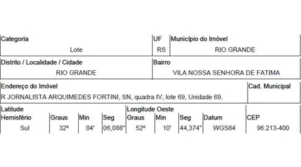 RUA ARCHIMEDES FORTINI,N. 69 QUADRA IV, LOTE 69, VILA NOSSA SENHORA DE FATIMA - CEP: 96200-000, RIO GRANDE - RIO GRANDE DO SUL